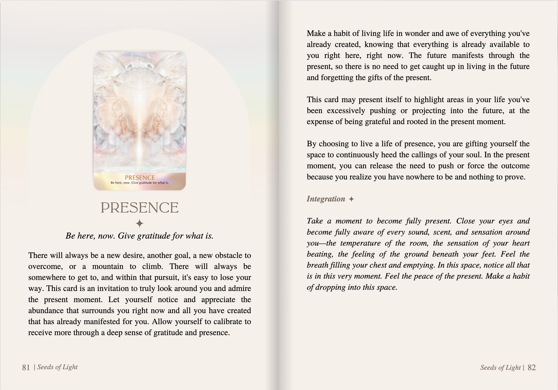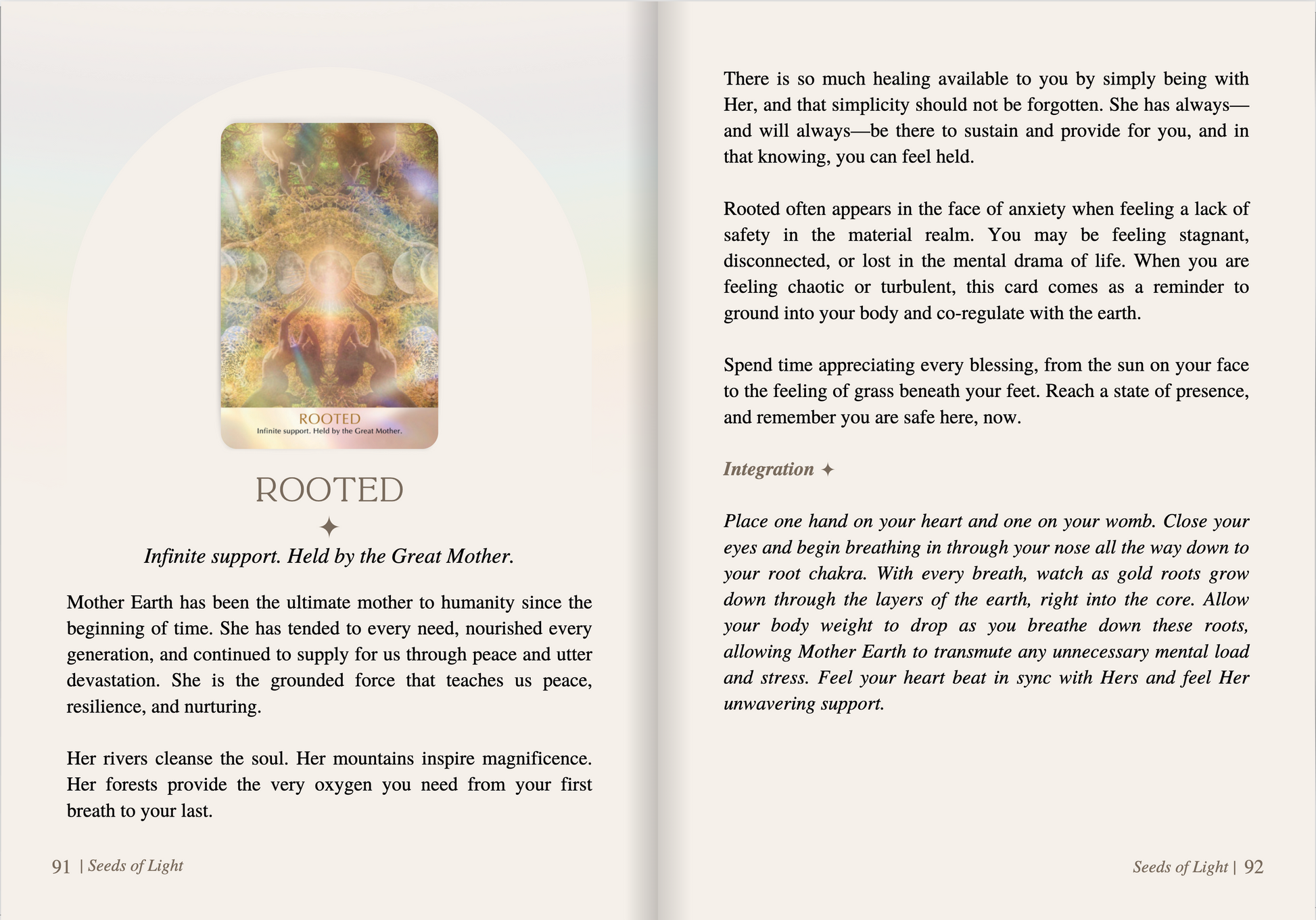 Your soul has been longing to live differently—to release societal conditioning and step into a more harmonious way of life. Seeds of Light Oracle Deck is a mystical yet grounded deck crafted to guide conscious leaders and changemakers on their journey. Through powerful, sacred transmissions, this deck encourages users to explore their deepest desires, illuminate their path forward, and embody their role as the sovereign creator of their reality.
