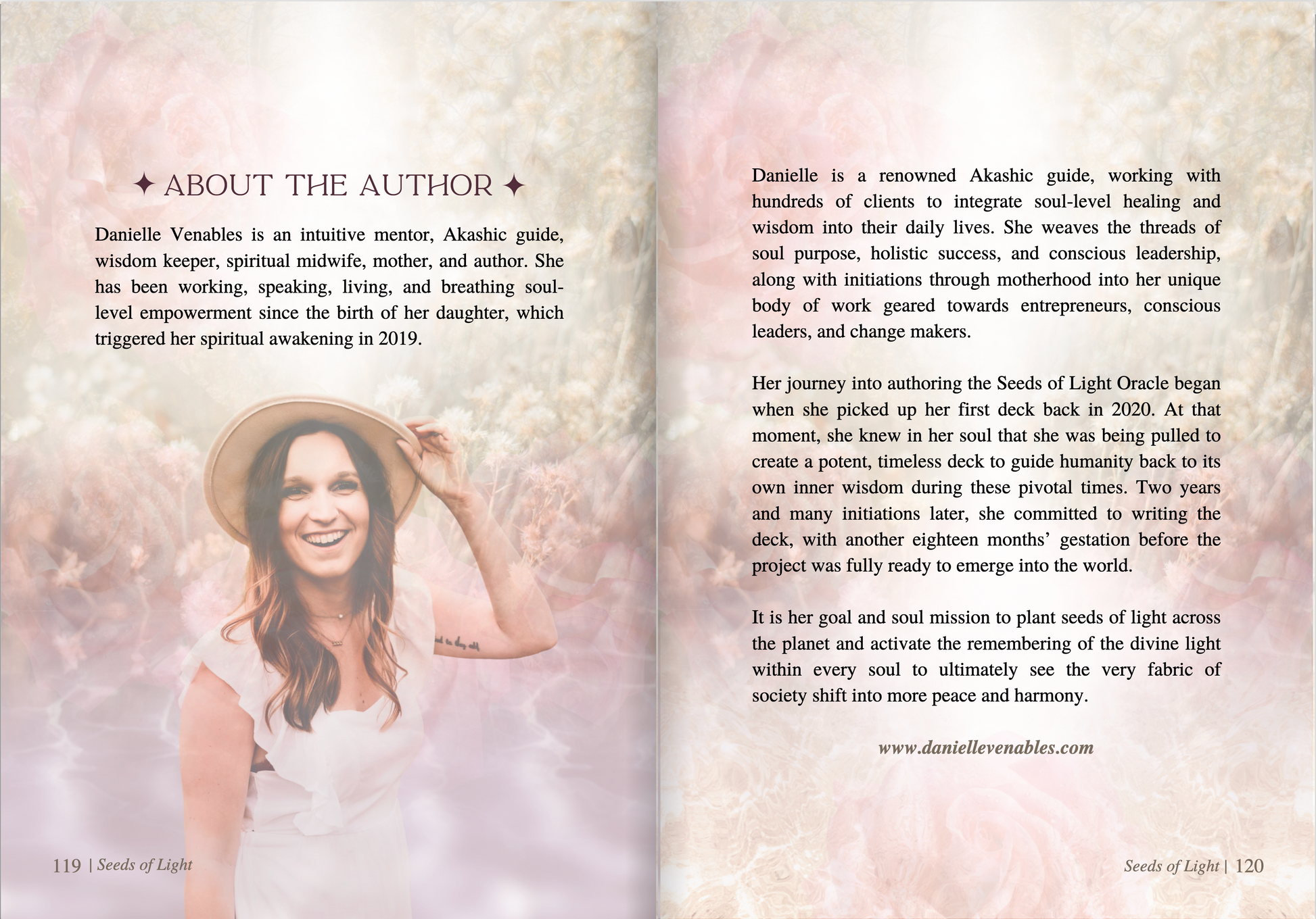 Danielle Venables is an intuitive mentor, akashic guide, wisdom keeper, spiritual midwife, mother, and author. She weaves together soul purpose, holistic success, conscious leadership, and motherhood initiations in her work with entrepreneurs and change-makers. Her journey into creating the Seeds of Light Oracle began when she first encountered oracle decks in 2020, sparking a mission to guide others back to their inner wisdom. Through this deck, she aims to plant seeds of light across the planet, activating the divine remembrance within every soul.